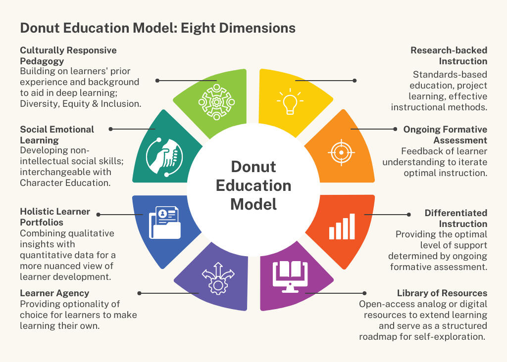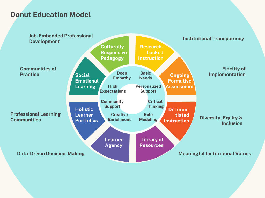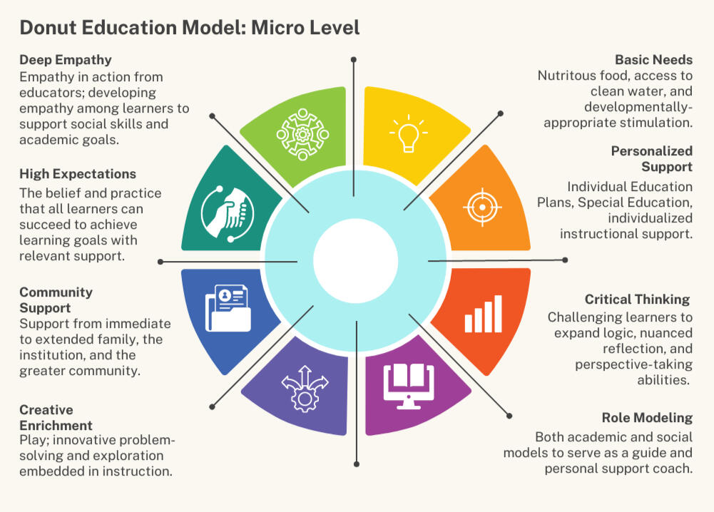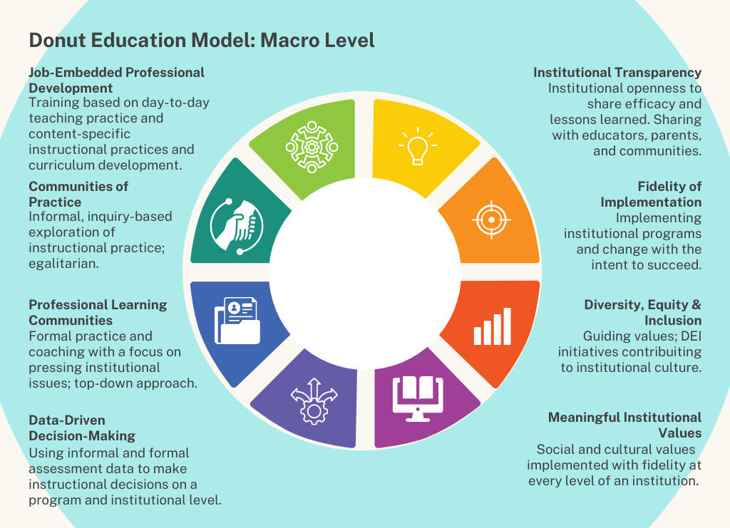 The Donut Education Model is a visual framework for learning that serves as the ideological underpinning of Donut Education. Its dimensions and supporting levels motivate every education and training project we take on.The Donut Education Model was inspired by Doughnut Economics, a holistic model of sustainability. We use the informal spelling of 'donut' as a nod to our dedication to providing open-access resources for educators and learners.The model is comprised of eight research-backed dimensions that support learning in a variety of environments.Eight Dimensions of the Donut Education Model are supported by a Macro Level, with a focus on support at the institutional level, and a Micro Level, which concentrates on the individual, learner level.The Macro Level of the Donut details organizational best practices for schools, universities, corporations, and any institution involved in education and training.The Micro Level includes personal support at the individual level, supporting culturally and linguistically diverse learners of all ages.Donut Education's Eight Dimensions are: